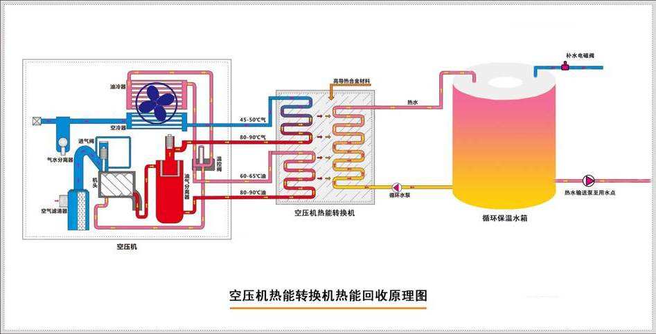 螺杆式空压机的工作流程:空气通过进气过滤器将大气中的灰尘杂质滤除后,由进气控制阀进入压缩机主机,在压缩过程中与喷入的冷却润滑油混合,经压缩后的混合气体从压缩腔排入油气分离罐,从而高温高压的润滑油经冷却器冷却后,返回油路进入下一轮循环。在以上过程中,大量的热能就被浪费掉了。