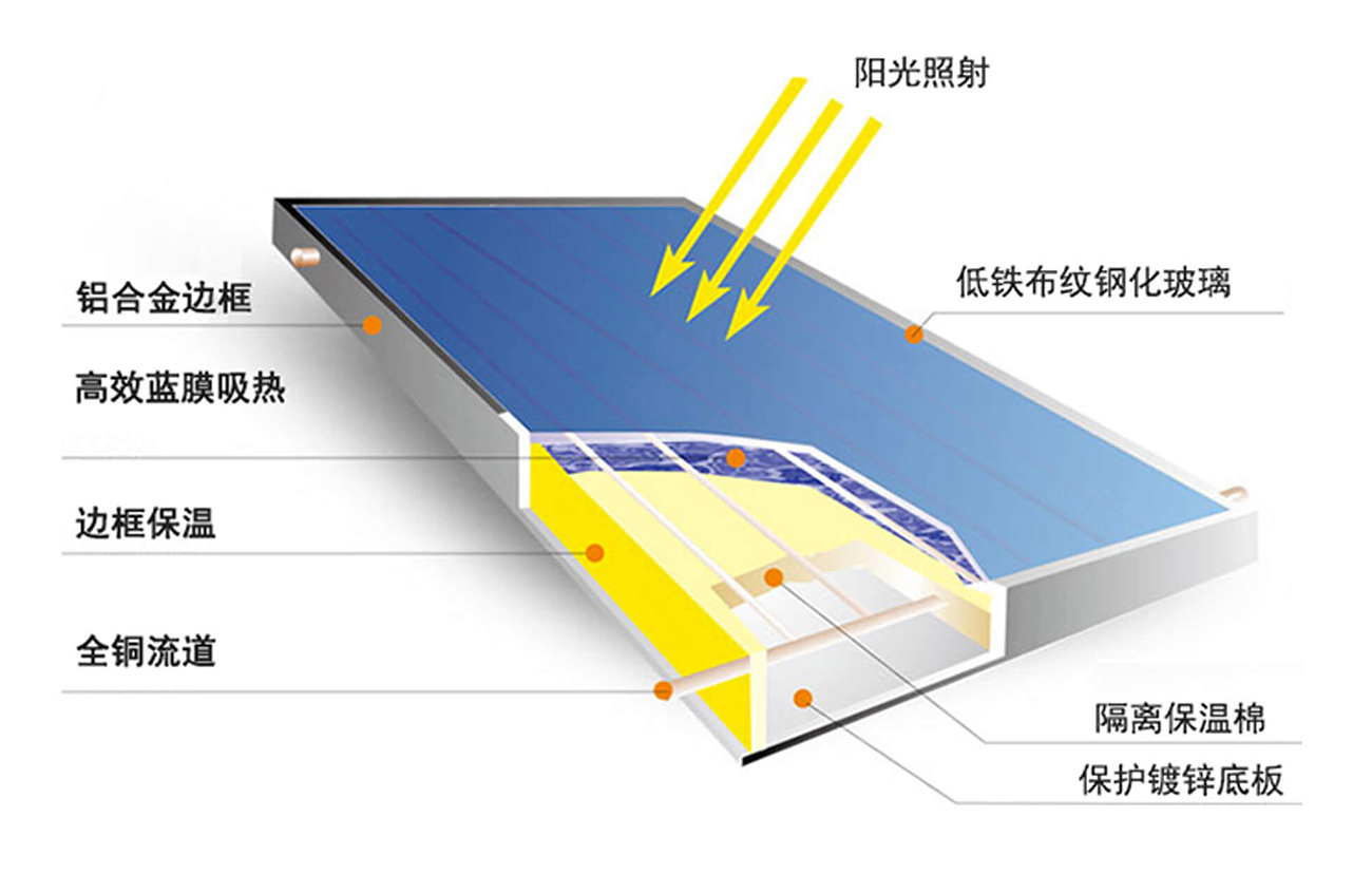 由黑铬制成的平板集热器,面积利用率高,升温快;阳光吸收比大于95%,更能有效守住热能