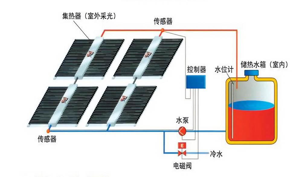 太阳能热水器:太阳能热水器是将太阳光照转化为热能的加热装置,将水从低温加热到高温,以满足人们在生活、生产中的热水使用。真空管太阳能热水器原理图